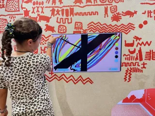 A l’aide de leurs doigts, les enfants dessinent sur des écrans interactifs dissimulés dans les petites cavités d’une paroi. Ils peuvent dessiner librement ou dessiner avec un « guide ». Ils tracent un trait dans une enveloppe pour dessiner : l’un des animaux de l’Amazonie préhistorique (paresseux géant, glyptodon, tatou, crocodile, piranha…) ou des formes géométriques ou des humains.