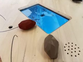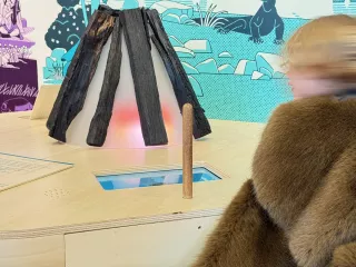 Ce dispositif phygital est à usage individuel ou collaboratif (2 max). Si les enfants collaborent, le feu brulera plus longtemps et la lumière sera plus intense. Ce dispositif interactif permet d’expérimenter les techniques de maitrise du feu : percussion, et friction. L’action de choc ou de frottement répétée feront jaillir des étincelles dans les écrans, allumant le feu