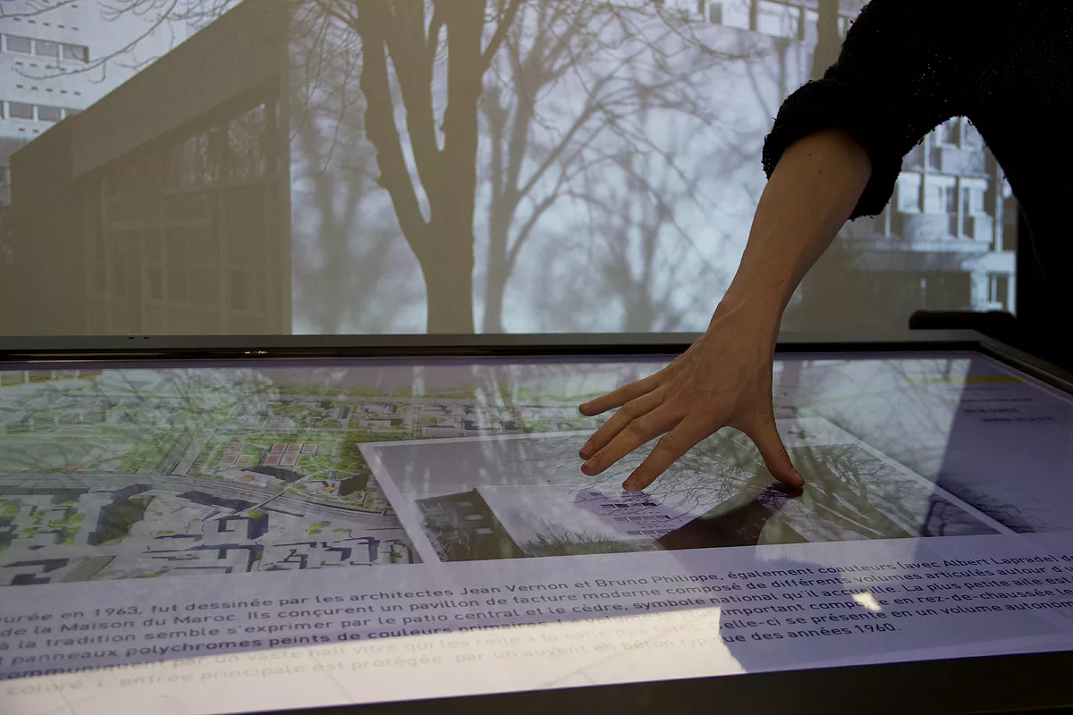 Intégrée dans un cube immersif de 9 m2, cette maquette interactive est composée d’une table multi-tactile de 60 pouces et d’un écran de projection de 140 pouces. Cette installation interactive dynamique dédiée à la consultation interactive d’ archives et de fonds muséographiques multi-média de la Cité Internationale Universitaire de Paris est un dispositif de médiation culturelle unique.
