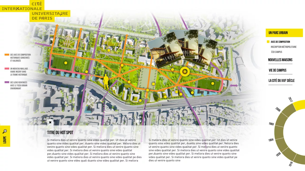 Ce dispositif révèle aussi en exclusivité les futures réhabilitations et le grand projet de développement de la Cité internationale qui va accroître sa capacité d’accueil de 30% à l’horizon 2017 grâce à la création de 1 800 nouveaux logements répartis dans 10 nouvelles maisons. Celle-ci se décline en 5 interventions principales : libérer et viabiliser les terrains constructibles, définir un dispositif végétal de protection vis-à -vis du boulevard périphérique, créer de nouveaux lieux de vie étudiante et moderniser l’offre sportive, affirmer les grands éléments de paysage, renforcer les liens entre la Cité et son environnement.