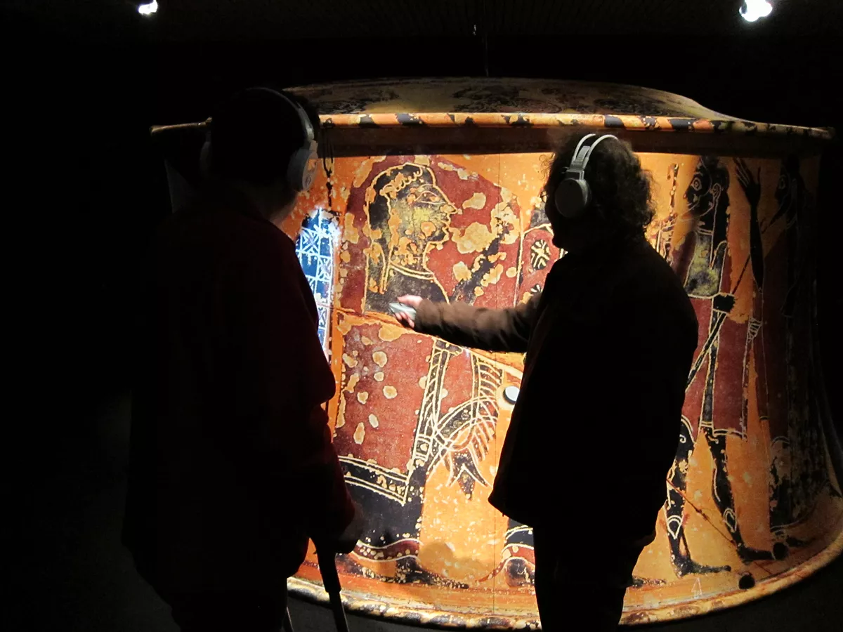 Chaque visiteur est équipé d’un pointeur laser et d’un casque. Le personnage visé, sur le vase, est éclairé et le son de sa voix est retransmis dans le casque. En introduction, le vase parle et s’adresse directement au visiteur. Dans le cas d’une visite de groupe, une personne (guide, enseignant, parent, ...) peut diriger un pointeur laser sur un personnage dont la voix sera retransmise dans tous les casques du groupe. Le visiteur est invité à déclencher les commentaires dans un certain ordre : l’ordre de l’histoire racontée sur le vase.