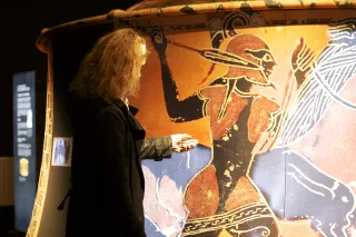 Il s’agit ici de la reproduction à très grande échelle d’un vase tripode à figures noires exposé au musée de Lille, réalisé vers 565 avant J.-C. à Athènes. Les guerriers apparaissent ainsi à taille humaine, révélant des détails qu’il n’est pas possible de voir sur le modèle d’origine. Le rapport visuel avec l’oeuvre est nouveau. Le visiteur est invité à interagir avec l’objet archéologique, dans un usage individuel ou collectif.