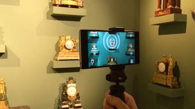 Pour compléter le dispositif de cartels numériques déjà déployé dans le musée l’année dernière, Mosquito a expérimenté cet été un dispositif de cartel augmenté via une tablette Tango. Pour obtenir les éléments d’interprétations de la salle « un cabinet d’amateur », le visiteur se saisi de la tablette sur son support, puis à travers l’écran, vise les horloges de la salle. une seconde passée sur un POI, il obtient un cartel et une mini notice, une secondes sur un cadran, il entend sonner le timbre de l’horloge visée. Le dispositif, en cours de finalisation sera prochainement mis en place dans la salle.