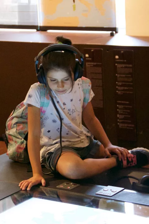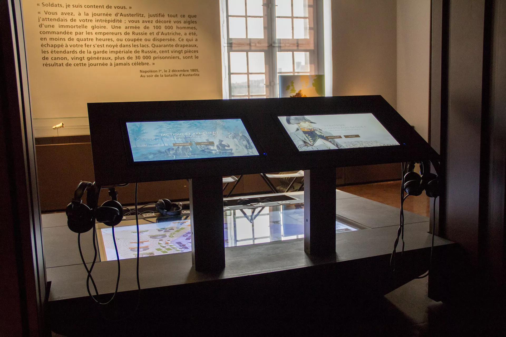 Les pupitres interactifs sont placés non loin des cartes animées créant dans la salle un véritable pôle multimédia. Ils sont composés d’un écran capacitif projeté (10 touches) et d’un PC I3 avec un disque dur SSD, l’ensemble est intégré dans une carrosserie très fine et totalement durcie. Ils diffusent des compléments d’informations, techniques et historiques et permettent d’approfondir les notions découverte lors du visionnage de la carte.