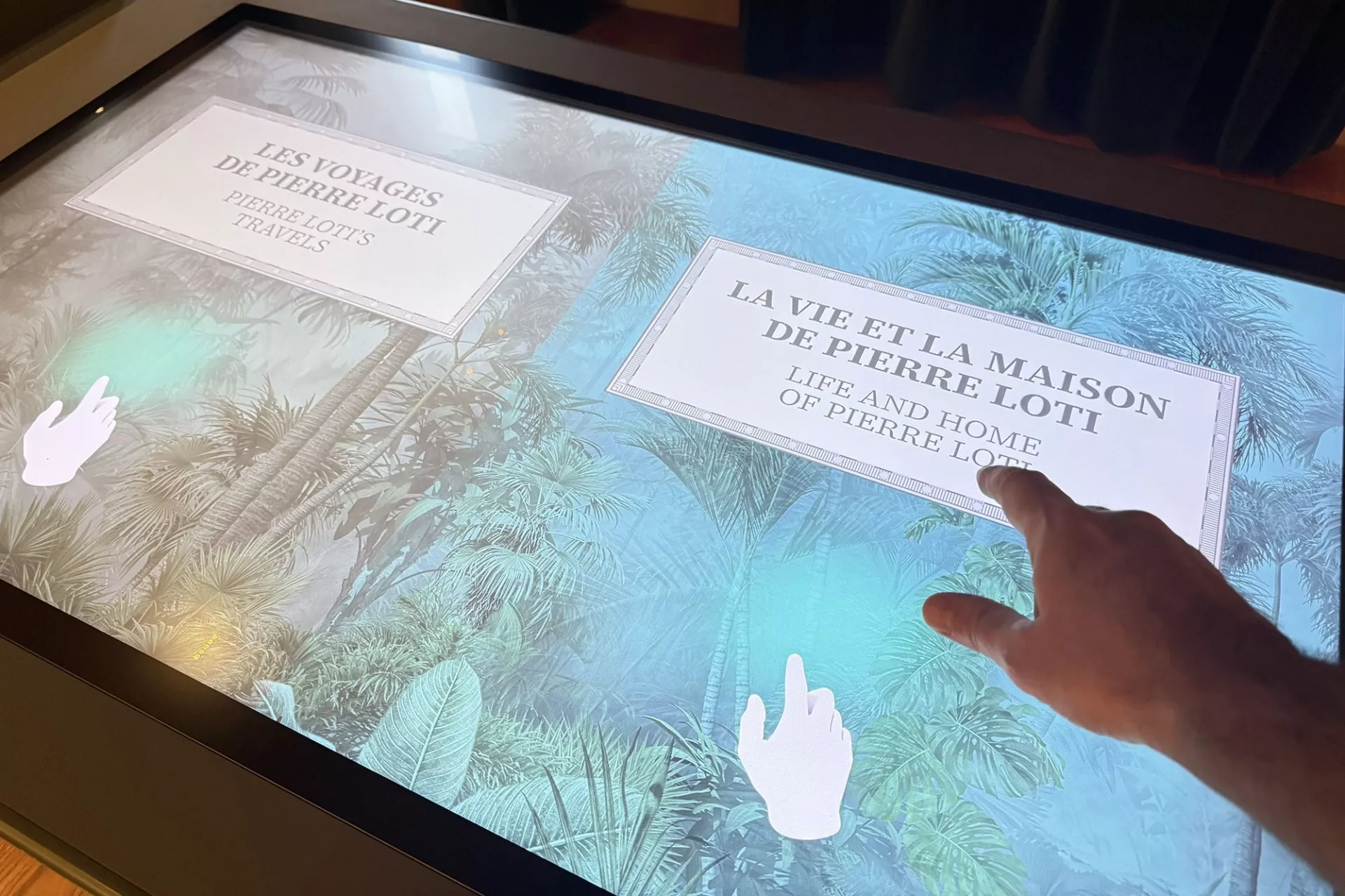 Au premier étage, un salon d’écoute permet d’entendre des extrais de lettres et de romans de Pierre Loti lu par des comédiens. A l’accueil une grande table numérique présente un large corpus de photos et de documents qui illustre les principaux voyages de Loti.