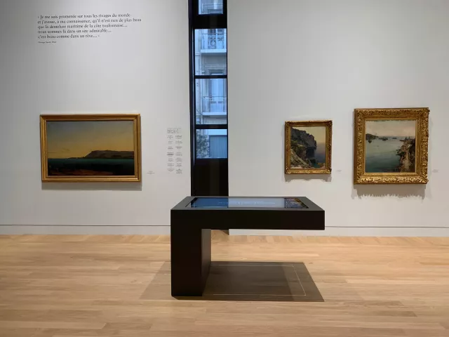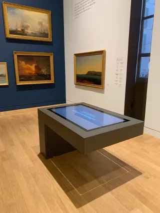 Une grande table tactile de 55“ est placée au centre de chacune des deux salle. Elles permettent au public de découvrir un corpus constitué des tableaux de la salle, de tableaux non accrochés mais faisant partie de la collection du musée de Toulon et d’œuvres issues de collections d’autres musées. L’interface principale est soit une carte de la région de Toulon (de Marseille à St Tropez), soit une carte de la Méditerranée. Couplée à un système d’intervalle chronologique les cartes permettent l’affichage de POIs (point d’intérêt) qui signale des contenus (image et notice). La carte est « zoomable ». La chronologie est organisée par date de naissance / date de mort des artistes.