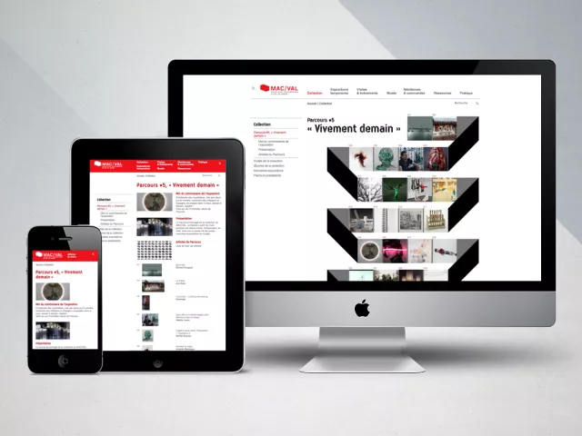 L’une de nos premières réalisations responsives a été le site Web du MAC VAL en 2011. Que l’on visite le site à partir d’un ordinateur doté d’un grand écran, d’une tablette tenue horizontalement, tenue verticalement, d’un smartphone, on bénéficie à chaque fois d’un graphisme adapté, parfois nettement différent.