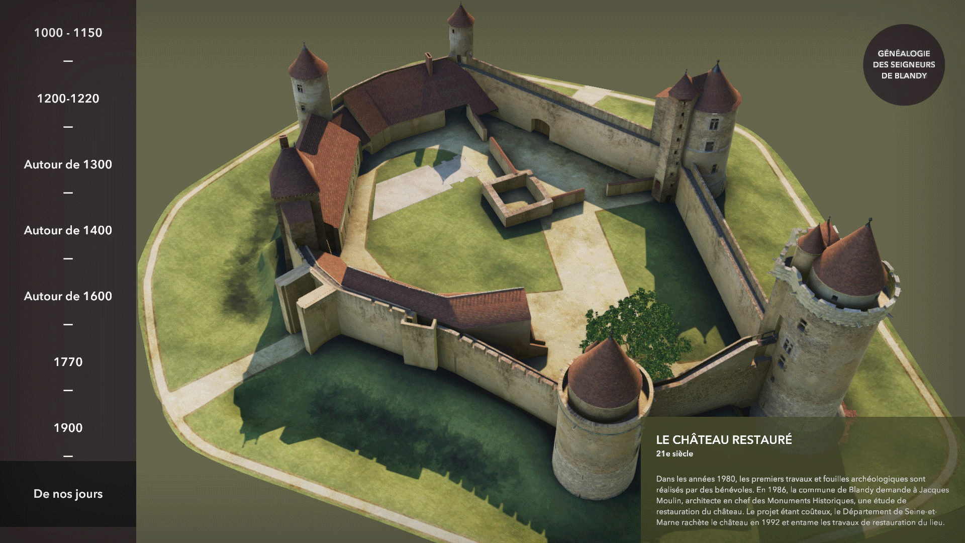 Une table numérique de grand format permet de manipuler une maquette 3D temps réel interactive du château restitué à 7 moments clés de son existence.
